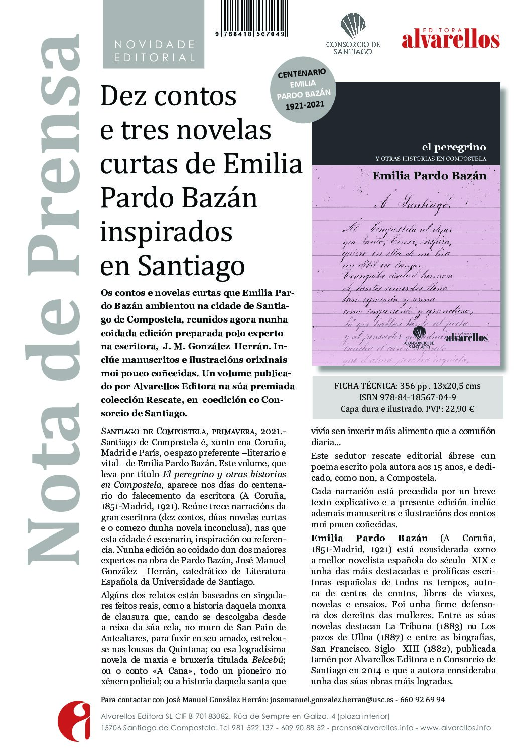 Santiago de Compostela es, junto con A Coruña, Madrid y París, el espacio preferente –literario y vital– de Emilia Pardo Bazán. Este volumen, que lleva por título El peregrino y otras historias en Compostela, aparece en los días del centenario del fallecimiento de la escritora (A Coruña, 1851-Madrid, 1921). Reúne trece narraciones de la gran escritora (diez cuentos, dos novelas cortas y el comienzo de una novela inconclusa), en las que esta ciudad es escenario, inspiración o referencia. En una edición al cuidado de uno de los mayores expertos en la obra de Pardo Bazán, José Manuel González Herrán, catedrático de Literatura Española y Profesor Emérito de la Universidad de Santiago.