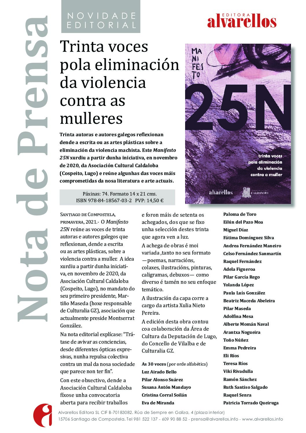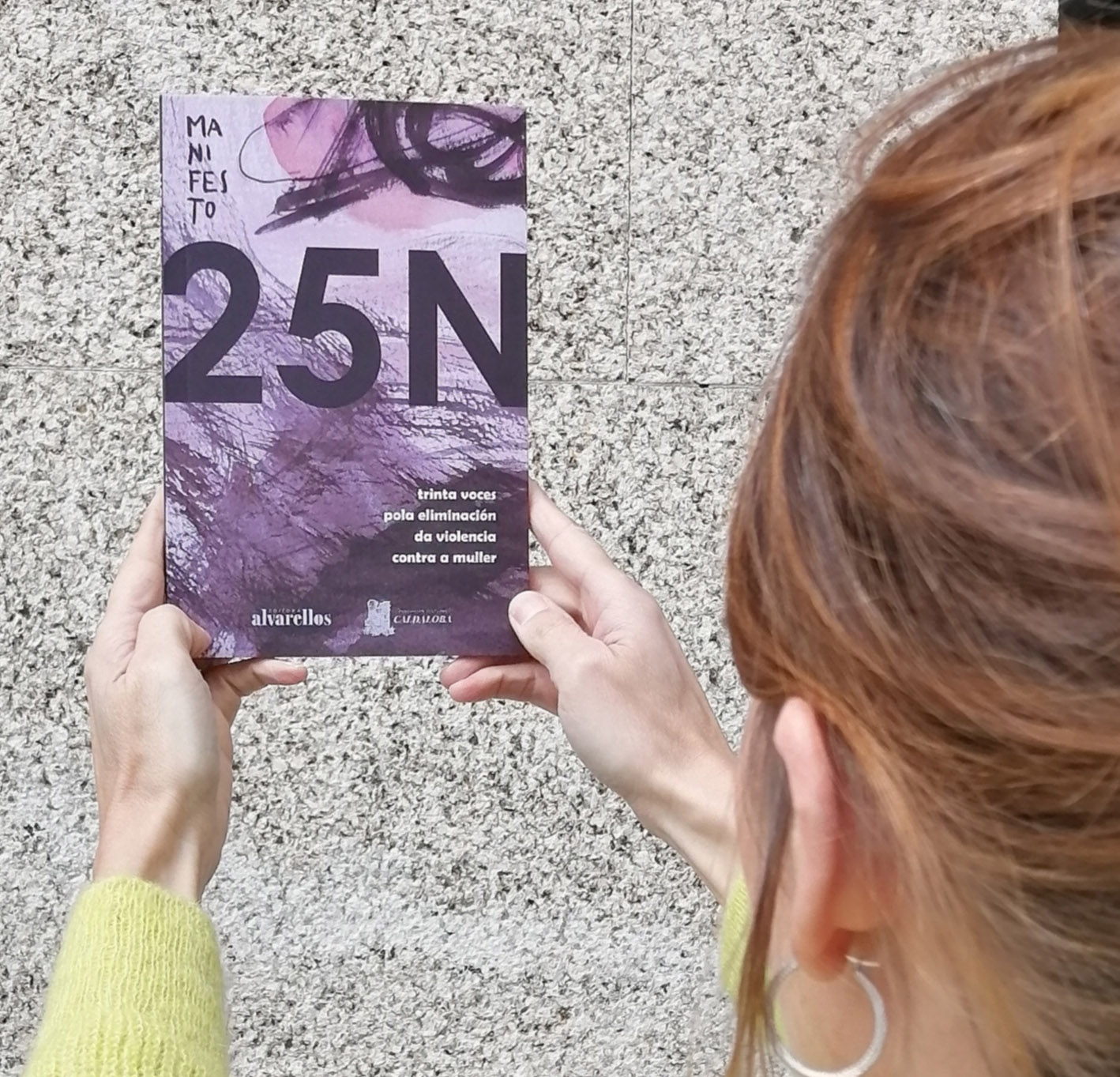El Manifesto 25N reúne las voces de treinta autoras y autores gallegos que reflexionan, desde la escritura o las artes plásticas, sobre la violencia contra la mujer. La idea surgió a partir de una iniciativa, en noviembre de 2020, de la Asociación Cultural Caldaloba (Cospeito, Lugo) cuando ocupaba la presidencia Martiño Maseda (hoy responsable de Culturalia GZ), asociación que actualmente preside Montserrat González.