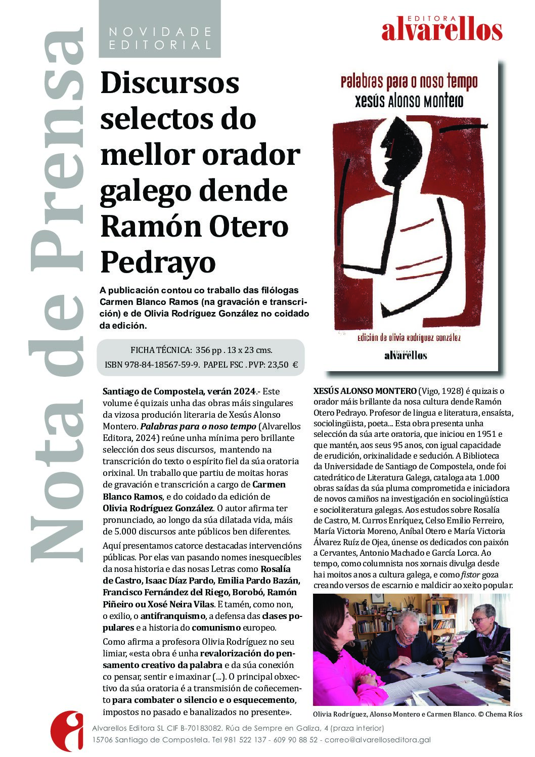 Este volumen es quizás una de las obras más singulares en la extensa producción literaria de Xesús Alonso Montero. Palabras para o noso tempo (Alvarellos Editora, 2024) reúne una mínima pero brillante selección de sus discursos, manteniendo, en la traducción, el espíritu fiel de su oratoria original. Es un trabajo que parte de numerosas horas de grabación y transcripción a cargo de Carmen Blanco Ramos, y del cuidado de la edición de Olivia Rodríguez González. El autor afirma haber pronunciado, a lo largo de su dilatada vida profesional, más de 5.000 discursos ante públicos muy variados.