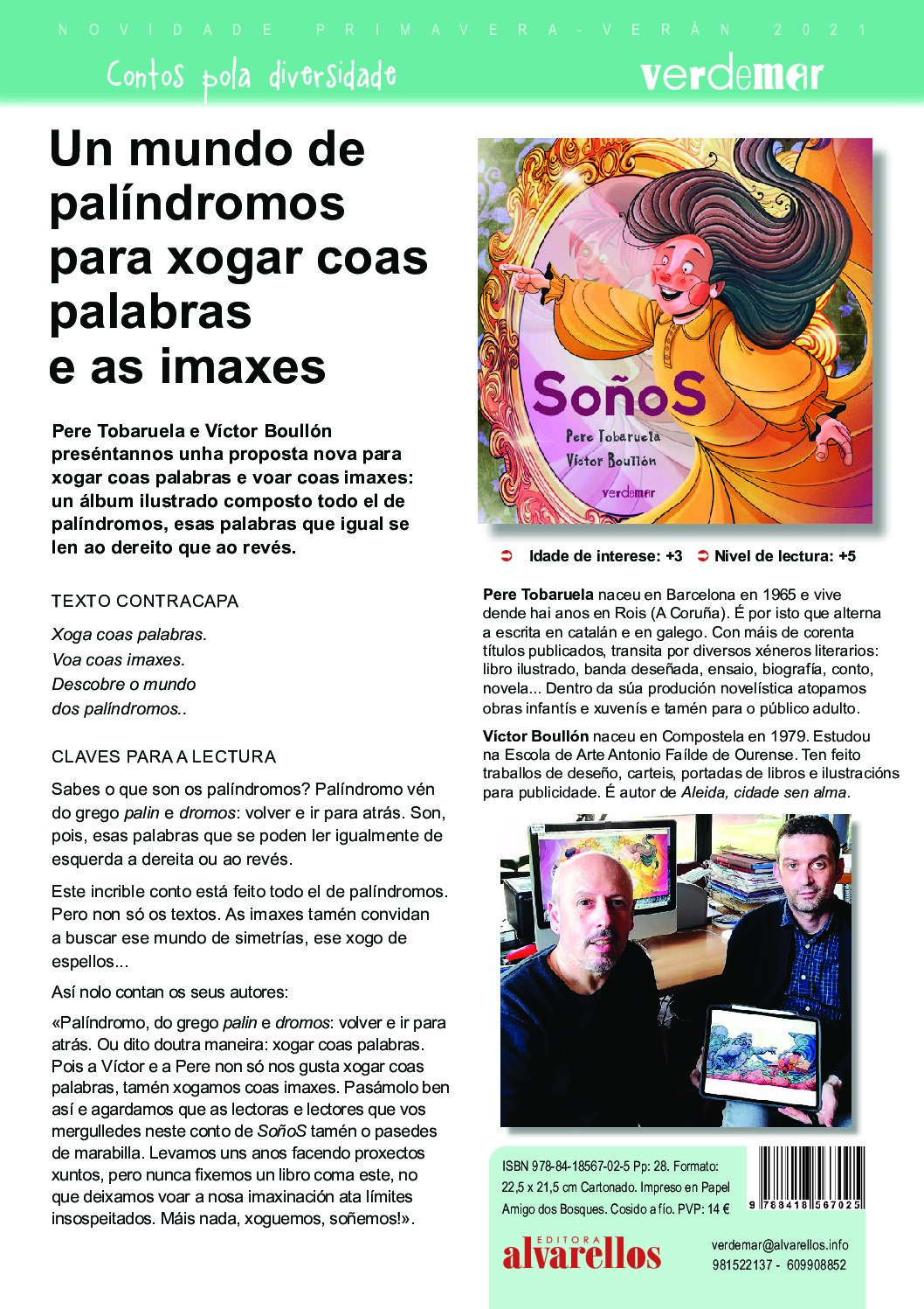 «»Palíndromo», do grego palin e dromos: volver e ir para atrás. Ou dito doutra maneira: xogar coas palabras. Pois a Víctor e a Pere non só nos gusta xogar coas palabras; tamén xogamos coas imaxes. Pasámolo ben así e agardamos que as lectoras e lectores que vos mergulledes neste conto de SoñoS tamén o pasedes de marabilla. Levamos uns anos facendo proxectos xuntos, pero nunca fixemos un libro coma este, no que deixamos voar a nosa imaxinación ata límites insospeitados. Máis nada, xoguemos, soñemos!».