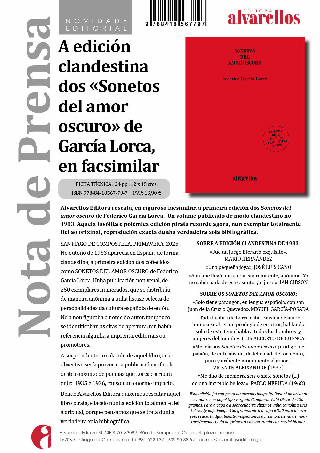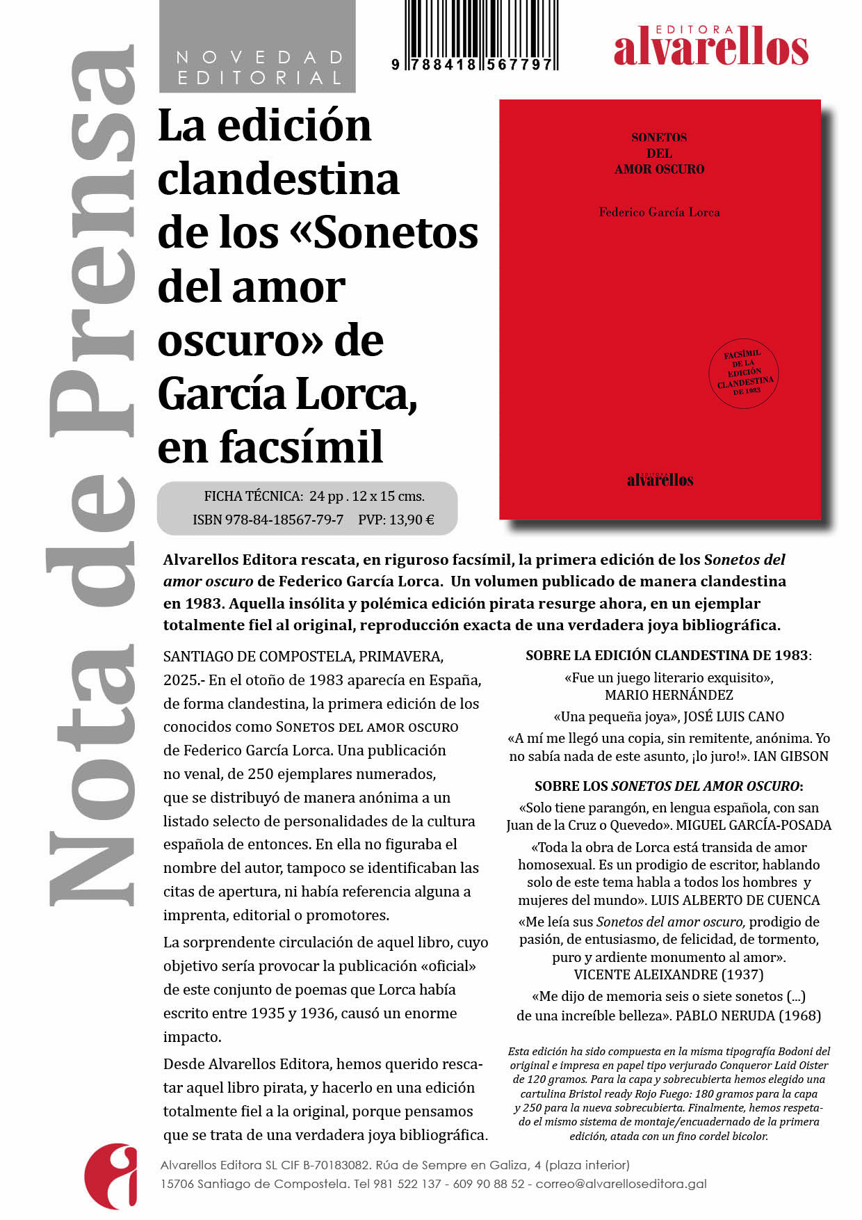 No outono de 1983 aparecía en España, de forma clandestina, a primeira edición dos coñecidos como Sonetos del amor oscuro de Federico García Lorca. Unha publicación non venal, de 250 exemplares numerados, que se distribuíu de maneira anónima a unha listaxe selecta de personalidades da cultura española de entón. Nela non figuraba o nome do autor, tampouco se identificaban as citas de apertura, nin había referencia algunha a imprenta, editoriais ou promotores.
